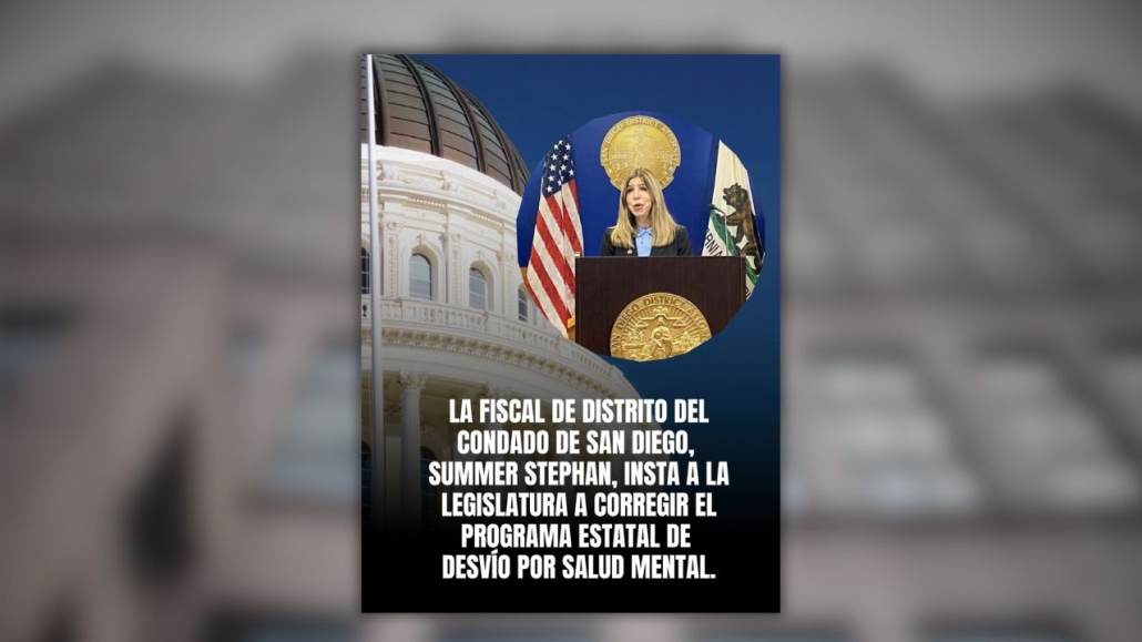 La Fiscal de Distrito del Condado de San Diego, Summer Stephan, se une a la Asociación de Fiscales de Distrito de California en su llamado estatal a la Legislatura de California para aprobar una legislación de sentido común sobre el desvío por salud mental (Mental Health Diversion, MHD), el Proyecto de Ley de la Asamblea 46 (AB 46). Esta legislación es patrocinada por la Oficina de la Fiscalía de Distrito del Condado de Sacramento y copatrocinada por numerosas oficinas de fiscales de distrito en todo el estado, incluida la Oficina de la Fiscalía de Distrito del Condado de San Diego. El proyecto de ley cierra vacíos legales en la ley de desvío por salud mental de California al restablecer la discreción judicial y garantizar que el programa proporcione tratamiento mientras protege la seguridad de la comunidad.